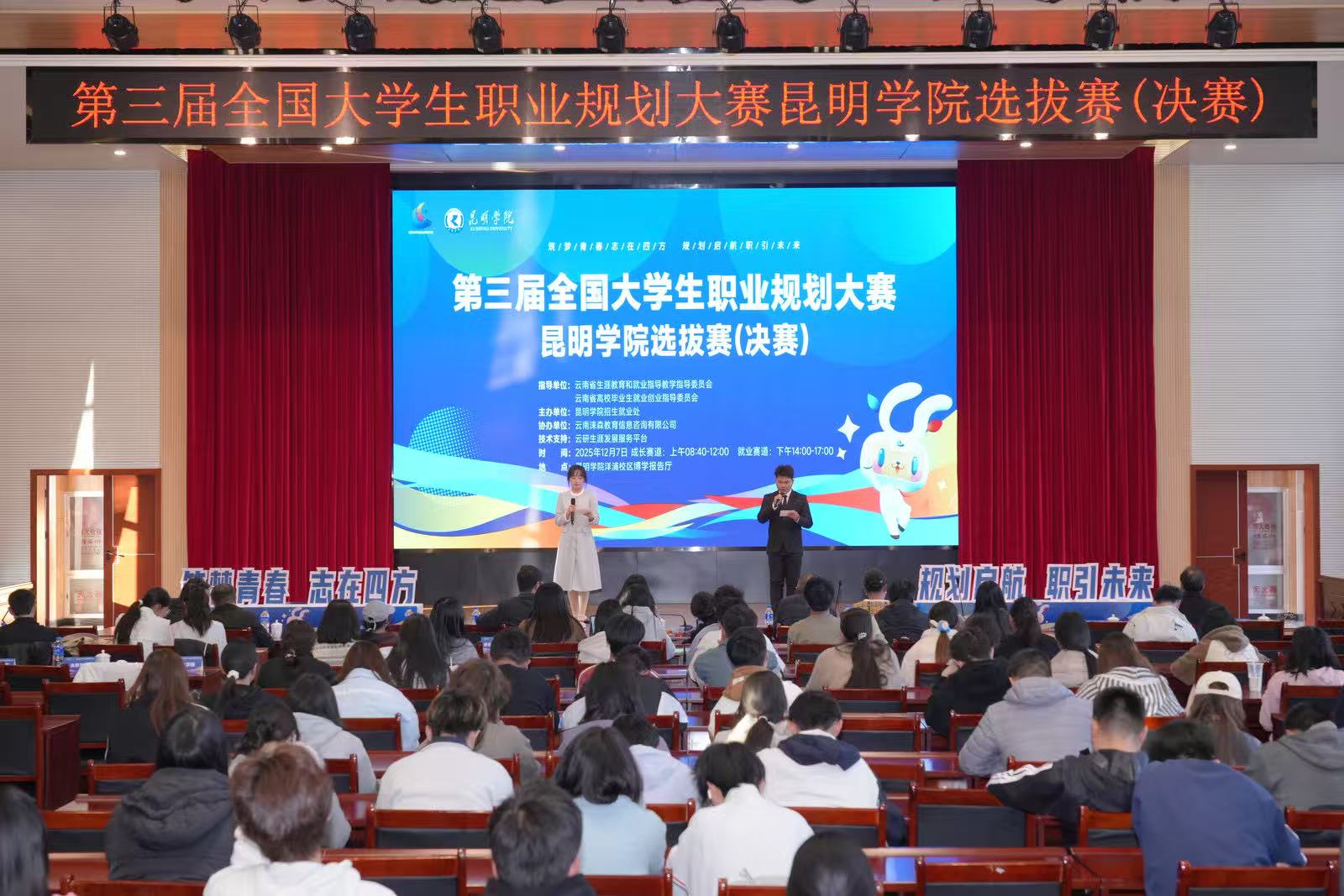 12月7日,第三届全国大学生职业规划大赛beat365官方网站校赛决赛在博学报告厅举办。云南省大中专毕业生就业服务中心杨宏伟主任,云南省生涯教育和就业指导教学指导委员会、云南省高校毕业生就业创业指导委员会的指导专家,学校招生就业处相关领导,就业指导服务中心全体教师,职业发展与就业创业指导课任课教师,各二级学院师生代表,近300人全程观摩了比赛。