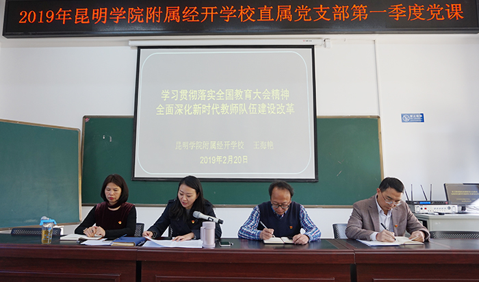 2019年2月20日上午,beat365官方网站附属经开学校直属党支部第一季度党课在211教室开展。支部书记王海艳同志带领大家共同学习题为《学习贯彻落实全国教育大会精神,全面深化新时代教师队伍建设改革》的主题党课。校长李晋德,副校长罗蓉、李广峰及支部全体党员、入党积极分子、中小学教师参加此次党课学习。
