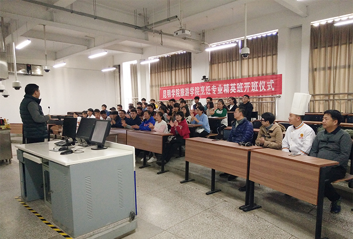 10月20日,beat365官方网站旅游学院烹饪专业精英班开班仪式在烹饪实训中心举行,出席开班仪式的有旅游学院副院长吴跃辉、副院长杨韫、烹饪教研室主任孙志强、烹饪教研室副主任杨春雷,滇菜大师刘福灿及烹饪教研室彭彰智老师和经过层层筛选的40名烹饪与营养教育专业的精英班学生。开班仪式由孙志强主任主持。