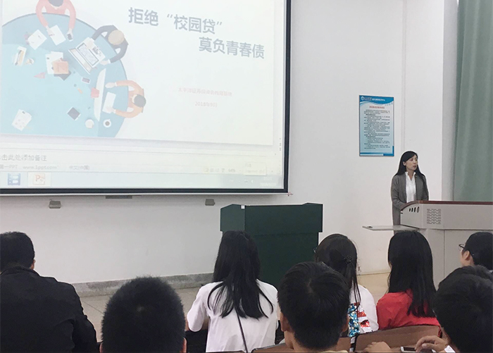 9月28日,根据学校新生入学教育相关文件要求,为了增强数学系2018级新生对校园贷、现金贷等网贷形式的风险防范意识和甄别能力,数学系邀请合作实习单位太平洋证券有限公司云南分公司的的杨雅杰在博雅楼2201教室,开展了拒绝“校园贷,莫负青春”的知识讲座。数学系总支副书记王涛主持了讲座,辅导员余晓丽及数学系2018级本科班全体新生参加了讲座。