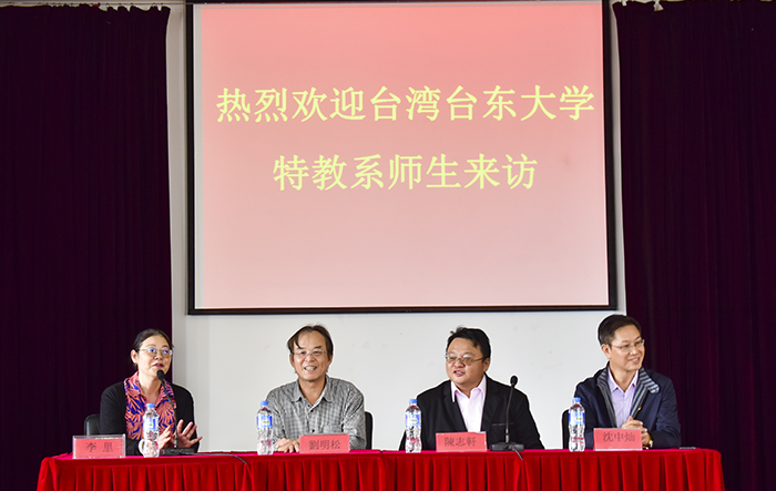 9月4日,为了加深海峡两岸特教专业的联系与互学互鉴,来自台湾的台东大学特殊教育专业的29名大四学生在特教系主任陈志轩及刘明松博士带领下来到学前教育与特殊教育学院,与我院特殊教育专业师生展开交流。交流活动在惟行楼4301开展,学院党委书记沈中灿、副院长李里出席了此次活动。活动由副院长李里主持。