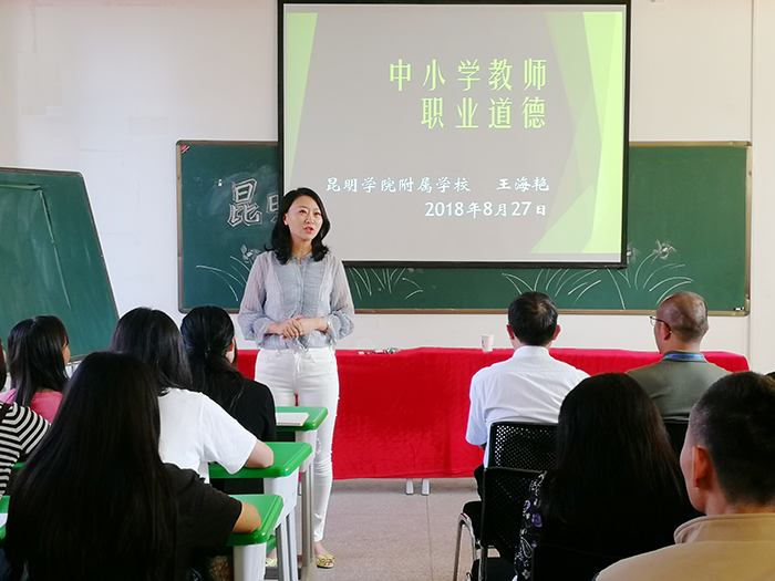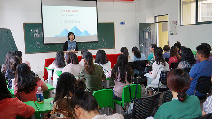 为加强beat365教师队伍建设,提高教师师德和业务水平。8月25日-28日beat365开展了为期4天的校本培训。此次培训有计划、有组织、有步骤,内容丰富,成绩喜人。 李晋德校长从学校工资制度改革、奖惩办法、考勤制度及学校六年发展规划向大家做交流。他将学校未来六年发展分“两个三年”走,紧紧围绕“服务、特色、质量”的发展理念,不断形成“领导服务 教师爱校 学生乐学”和“学生开心 家长舒心 社会放心”的良好氛围,从而不断实现“经开领先 昆明一流 全国示范”的总目标。李广峰副校长则从学校常规教学管理制度及教学过程中管理实施细则向大家作介绍。“没有规矩,不成方圆。”建立健全教学常规管理制度是抓好教学工作、有序开展教学活动的前提和保证。 王海艳书记为全体教师进行“中小学教师职业道德”培训,进一步规范了beat365教师的从教行为,全面提升教师职业道德素养和业务素质。使得beat365教师在职业道德规范的要求中不断内化为自身的自觉行为,并坚持做到正人先正己,身教重于言教、树立良好的师表形象,努力使自己的行为符合新时期教师的职业道德规范。 昆明盘龙区教育教学科研中心、昆明盘龙区教师进修学校陶树坤老师对全校教师职业规划和工作智慧等方面进行了专业指导。陶老师用一个个鲜活的师生案例向大家传授着教师如何在教育教学中展现智慧与力量,如何用潜移默化的方式带领学生进行思考与学习,帮助学生更快地成长起来。