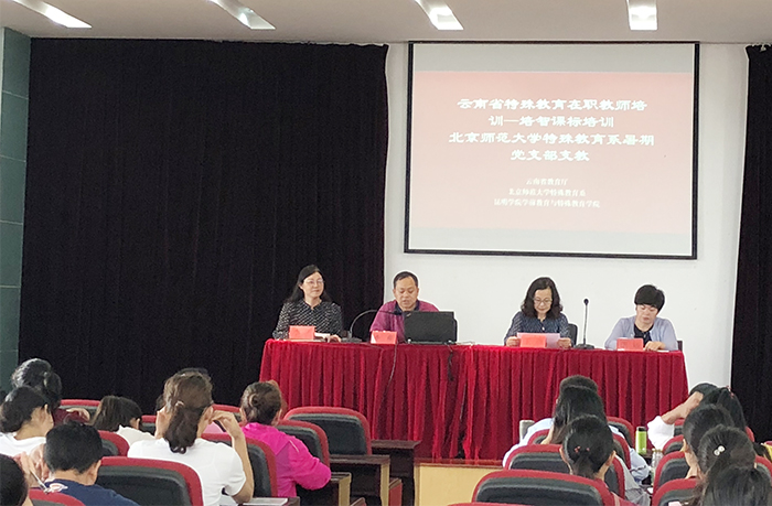 6月29日,学前教育与特殊教育学院在惟行楼5栋3楼报告厅举行2018年云南省特殊教育师资培训——培智学校课程标准培训(第一期)开班仪式。云南省教育厅基础教育处副处长李舜、学前教育与特殊教育学院院长唐敏、党支部书记刘亚彬、副院长李里,北京师范大学特殊教育系暑期党支部支教专家王雁、刘艳虹等教授,全体省培教师、骨干教师137人参加开班仪式。