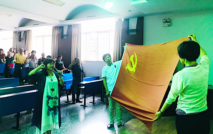 庆祝大会在雄伟庄严的《国歌》声中拉开了帷幕。全体与会党员面向鲜红的党旗,庄重地举起右手,重温入党誓词,再一次激发了大家作为一名共产党员的自豪感。