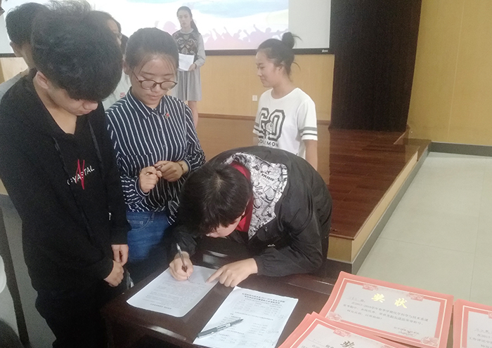 由16化检班的卢佳佳同学代表学生发言,她也表示了诚信考试的重要性,宣誓坚决抵制考试作弊行为,文明考试。会后,在各位老师以及现场参会同学的见证下,各班代表签署了考试承诺书。
