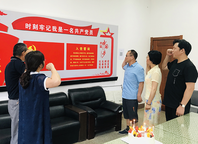 活动中,党支部书记对过“政治生日”的9位党员表达了节日的祝福,并将一张张承载特殊意义的“政治生日卡”发放给过生日的党员。全体党员在支部书记的领学下集体学习了党章,提醒全体党员始终牢记自己是共产党员,要做到对党忠诚,不忘初心,以奋发有为的精神状态投身到学校的改革发展建设中去。随后,10年、20年30年党龄党员一起面对党旗,重温入党誓词,在思想上再次接受“洗礼”,切实增强“四个意识”, 坚决做到“两个维护”,始终保持共产党员的政治本色。随后,过政治生日的党员结合自身实际发言,回顾成长历程和入党以来的切身感受,并一起分享生日蛋糕。