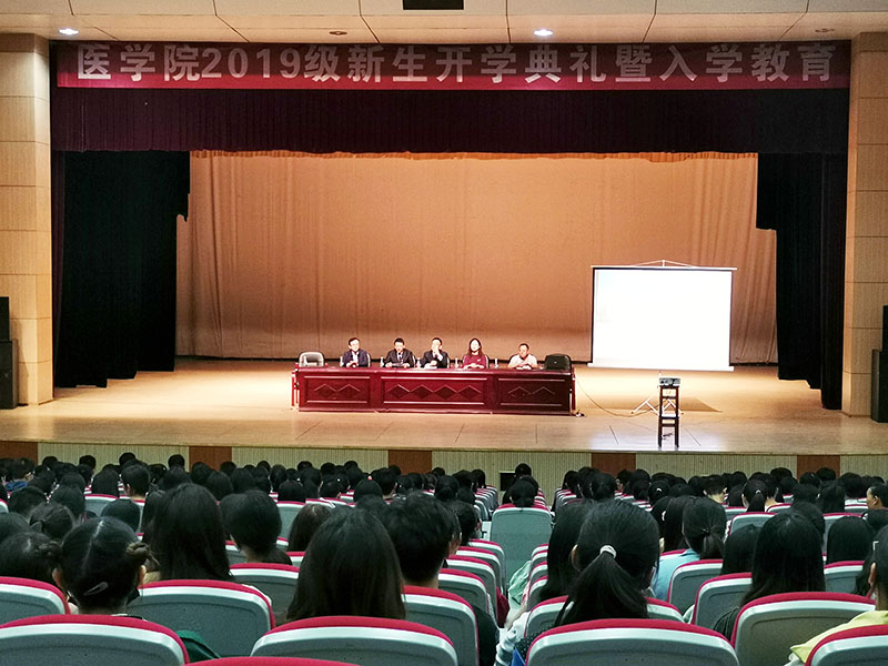 8月31日下午,医学院在学生会堂举行2019级新生开学典礼暨入学教育大会。医学院党委书记王建华、院长余珊、副书记张培宏、副院长杨兆宇、副院长陶剑、系主任、2019级辅导员、班主任及485名新生参加了大会,会议由张培宏主持。