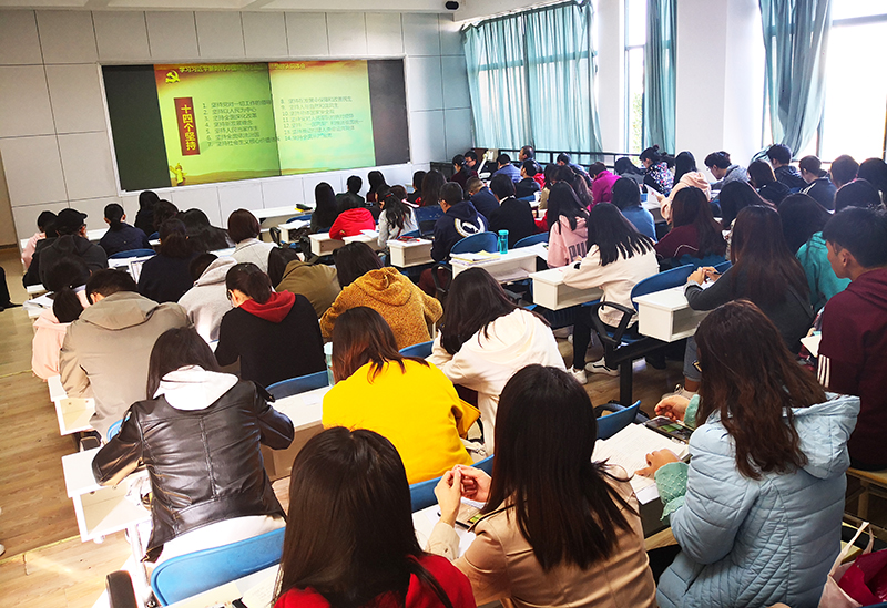 学院全体师生党员参加党课学习,学校主题教育第五指导组组长伍雁红同志、成员喻玲同志到会并对专题党课进行测评。