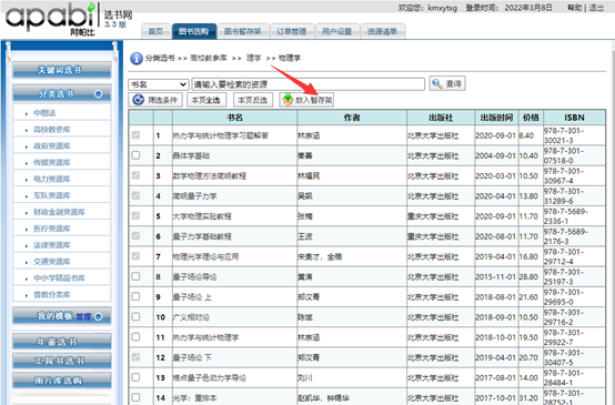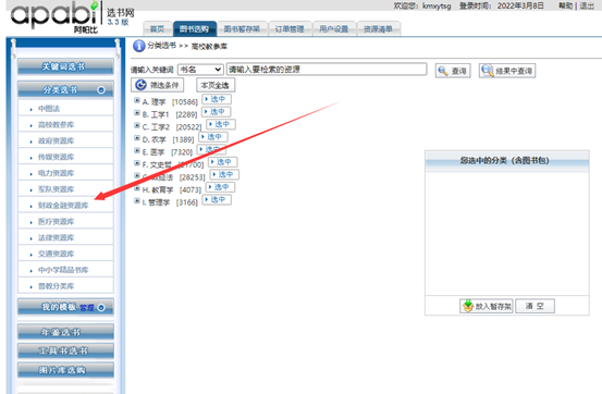 第二步:点击左侧分类栏,选择图书类别,放入暂存架。