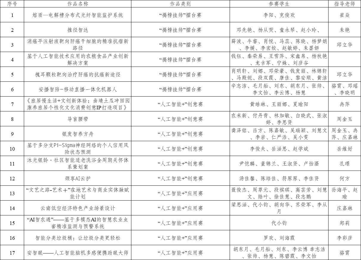 为全面落实科教兴国战略、人才强国战略、创新驱动发展战略,充分激发beat365青年学子创新潜能与创造活力,推动理论知识与实践应用深度融合。beat365官方网站于2025年6月-7月积极动员青年学子报名参加2025年“挑战杯”全国大学生课外学术科技作品竞赛“人工智能+”专项赛和“揭榜挂帅”擂台赛,经过遴选最终确定推报6个项目参加“揭榜挂帅”擂台赛,推报11个项目参加“人工智能+”专项赛,现将参赛作品情况予以公示。