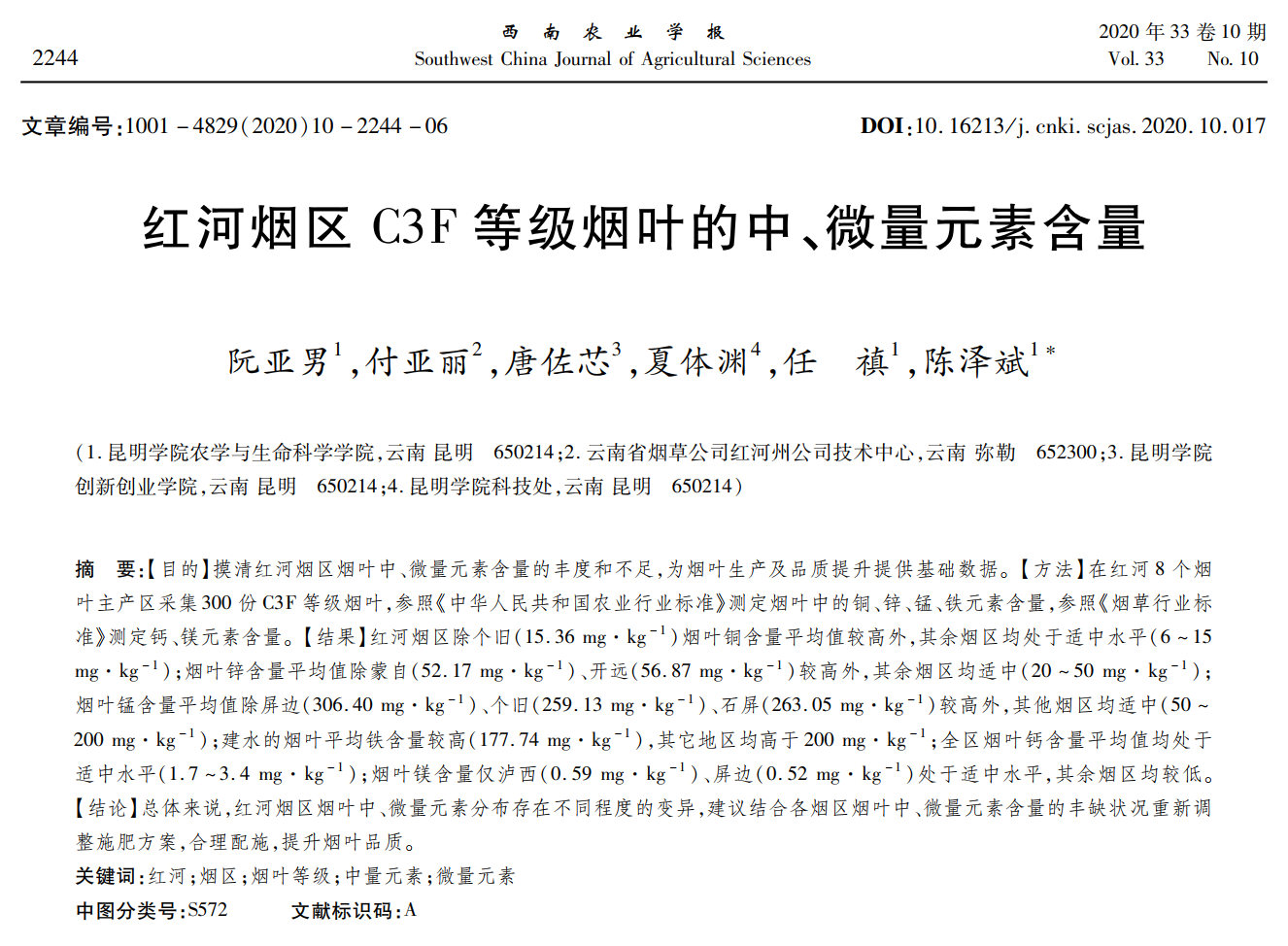 该论文分析了红河烟区烟叶中、微量元素含量,对提升红河州烟草生产水平,实现高质高产具有重要意义。该项研究得到学校科学技术处和农学与生命科学学院在经费、实验室、仪器设备等方面的大力支持。