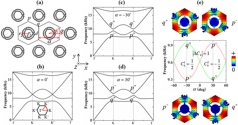 在研究中,空心三开口圆柱构成二维三角晶格,它的空间反演对称性可以通过旋转来打破,对称性降为可以C3v从减低到C3。,以此实现对称破缺。如下图1,杨海课题组计算给出二维声子晶体结构、不同旋转角度对应的能带结构和相变图,可以看到通过旋转圆柱,声音形成环流,环流分为顺时针和逆时针。