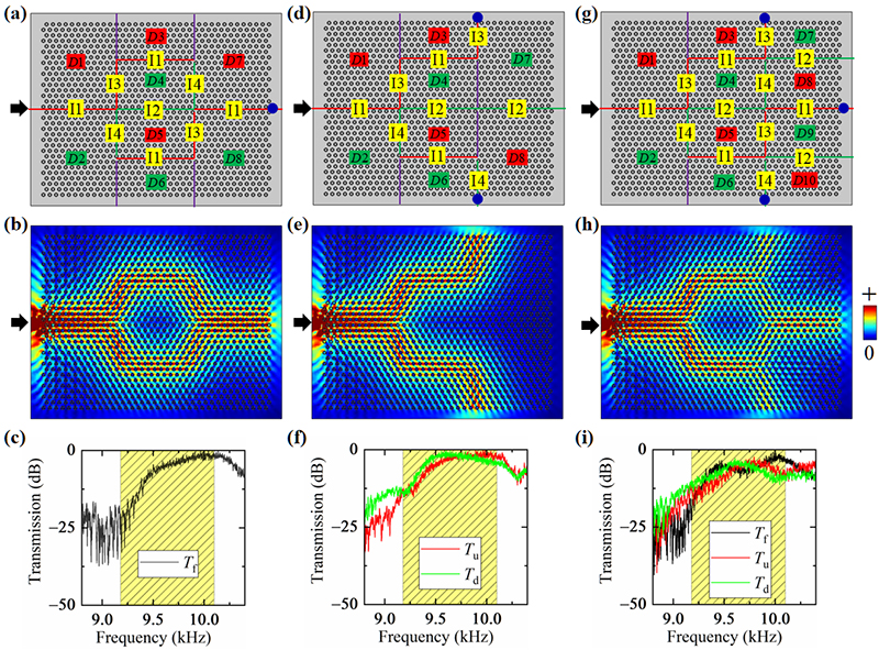 最后,在上述结果的基础上,实现声波分束和聚合,并在实验上实现复杂波导中谷界面态的多通道输运。如下图5所示,利用具有不同路径的复杂波导,可以将某个方向的声波近乎无损的传输到一或多个特定的方向,例如单通道传输中向右传播,双通道传输中向上和下传播,以及三通道传输中向上、下和右传播。此外,只要谷界面状态频率合适,不同方向传输的声波振幅可以使之相等。这些结果有助于利用具有不同界面的复杂波导构造多通道声谷拓扑输运器件。