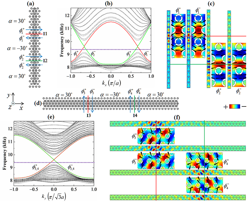 根据上图中的相变图构造具有不同界面(Zigzag界面和Armchair界面)的异质结,杨海课题组理论计算出如下图2所示的带结构和谷态声压分布。可以看出,具有Armchair界面的异质结构的谷界面态存在于整个动量空间中;然而,具有zigzag界面的异质结构的谷界面态只存在于动量空间的一半。因此,具有zigzag界面的异质结构的谷界面态是纯谷态,而具有armchair界面的异质结构的谷界面态是混合谷态。这种特性为交叉波导中的声波分束和聚合提供了基础。