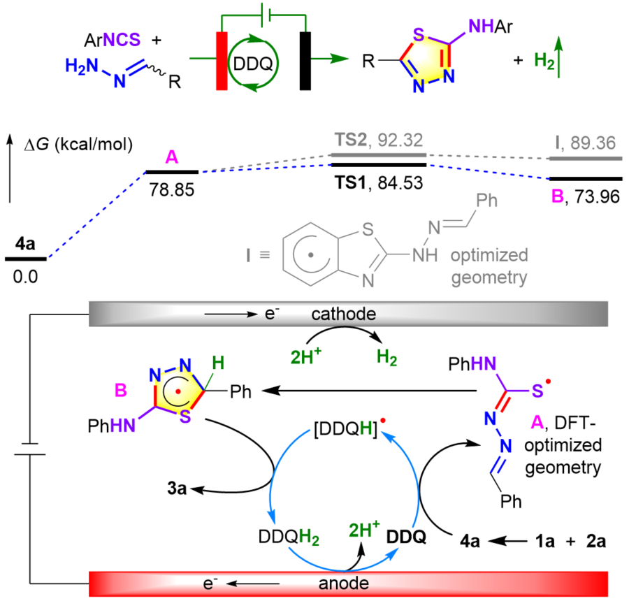 该篇论文以芳基异硫氰酸酯和简单醛腙为起始原料,开发了2,3-二氯-5,6-二氰对苯醌(DDQ)催化的2-氨基-1,3,4-噻二唑电化学氧化合成。该反应温和、清洁、高效、底物范围广,无需过渡金属催化剂和化学氧化剂,且可轻易放大到克级规模。系统的反应机理研究表明,该反应先后经历分子间亲核加成/分子内选择性C-S偶联串联过程,此外在阳极被氧化的是催化剂DDQ而不是反应中间体氨基硫脲。