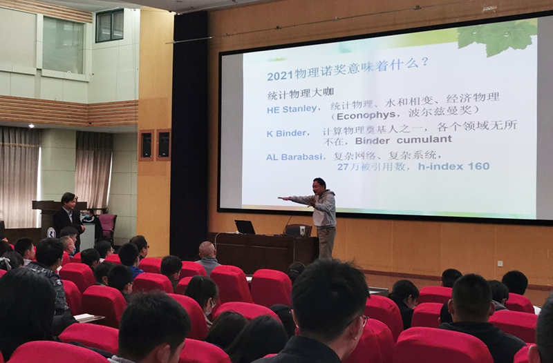 10月15日,云南大学物理与天文学院院长、博士生导师郑波教授应邀到beat365官方网站物理科学与技术学院作“统计物理与复杂系统—Parisi与2021年诺贝尔物理奖”的学术讲座。讲座由物理学院杨海教授主持,物理学院教师、硕士生及本科生聆听了讲座。