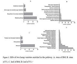 本研究工作紧密围绕云南省特色经济作物工业大麻,前期研究显示钾素是影响工业大麻生长发育和新陈代谢最重要的元素之一,对产量的形成具有重要作用。本研究率先通过SWATH蛋白质组学技术,研究耐低钾籽用大麻品种(BM)和低钾敏感型纤用品种(Y1)在低钾胁迫(0.4 mmol/L K+)处理下快速生长的茎、叶片差异蛋白质组学,通过LC-ESI-MS/MS质谱鉴定分别得到BM和Y1差异蛋白,茎:288和353,叶:226和256。分析两个品种的KEGG,发现Y1叶片、BM叶片、Y1茎和BM茎的差异蛋白分别显著富集在15、3、11和4个pathway。通过比较分析差异蛋白,本文发现耐低钾品种BM主要通过以下机制适应低钾胁迫:茎叶皆表现出叶绿素合成下降,降低光合作用;茎杆提高淀粉代谢,提高抗氧化能力,提高木质素代谢,促进细胞膜合成和细胞分裂,促进乙烯合成;叶片调节节气孔关闭,加强光呼吸和光能传递,蛋白合成代谢旺盛。试验结果可为未来工业大麻高效吸收钾素的分子研究提供重要的参考蛋白和基因信息。
