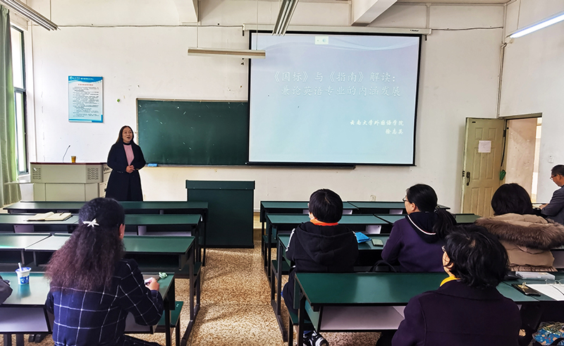 12月3日,云南大学徐志英教授受邀到外国语学院作题为《<国标>与<指南>解读:兼论英语专业的内涵发展》的学术讲座,并对学院国家社科基金重点培育教师进行了指导。讲座由外国语学院院长陈静主持,全体教师参加了此次讲座。