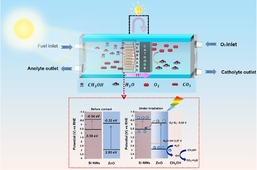 基于Si NWs@ZnO异质结阳极的光辅助甲醇燃料电池机理图