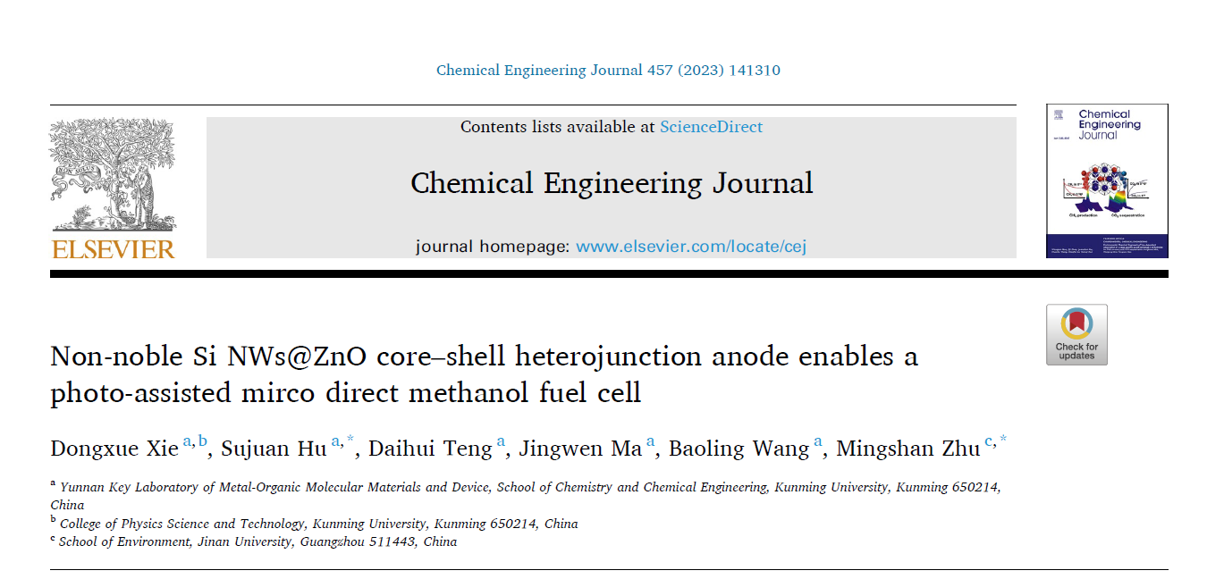 近日,beat365胡素娟副教授课题组在工程技术与化学化工领域最有影响力的三大顶级刊物之一《Chemical Engineering Journal》(影响因子: 16.744)上发表了题为“Non-noble Si NWs@ZnO core–shell heterojunction anode enables a photo-assisted mirco direct methanol fuel cell”的研究论文。该文以beat365官方网站为第一单位,2019级硕士研究生谢冬雪为第一作者,暨南大学朱明山教授为共同通讯作者。该工作获得了国家自然科学基金-青年基金和地区基金、云南省地方本科高校基础研究联合专项-重点项目、云南省化学化工学院云南省高校科技创新团队的资金支持。