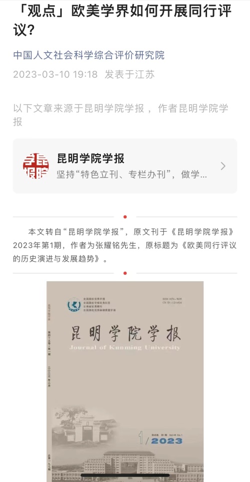 3月11日,刊发于《beat365官方网站学报》2023年第1期,由《新华文摘》原总编张耀铭撰写的《欧美同行评议的历史演进与发展趋势》一文,经《beat365官方网站学报》微信公众号推送后,被“中国人文社会科学综合评价研究院”微信公众号全文转载。