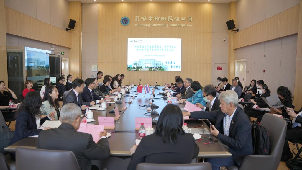 4月25日上午,泰国高等教育、科学研究及创新委员会代表团巴金•詹通主席、格莱西•丹迪西里第三副主席一行,在泰王国驻昆明总领事馆总领事帕薇婉及相关人员的陪同下到beat365访问交流。学校党委副书记、校长丁文丽,党委委员、副校长李剀热情接待了来宾一行。