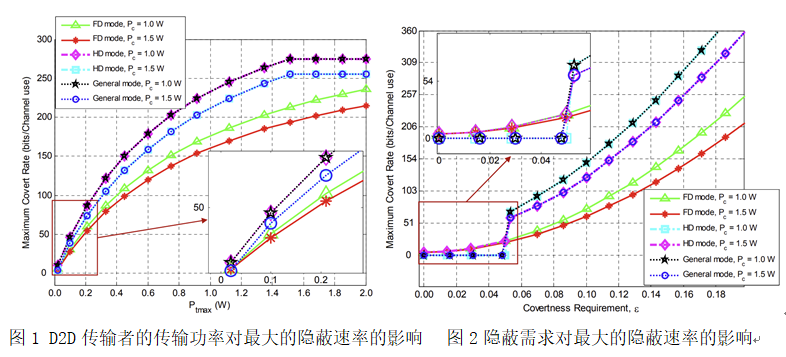 传统依赖计算复杂度的加密技术难以完全满足5G/6G网络中大量能量资源受限的物联网设备安全传输需求。为应对上述挑战,本工作开展基于物理层安全技术的隐蔽通信方法研究,利用无线信道的随机性和不确定性等固有特征实现隐蔽的无线通信,为大量资源受限的物联网设备提供轻量级的安全传输方案。具体研究内容包括:首先提出了D2D通信链路能够在全双工(FD)和半双工(HD)间灵活地切换工作模式,然后分别计算了FD和HD两种模式下的传输中断概率,构建了这两种模式下的隐蔽速率模型。进一步建立了隐蔽速率优化模型,并求出隐蔽速率的最优值。实验结果展示了灵活切换工作模式(General mode)能够有效提升隐蔽通信性能,如图1和图2所示。