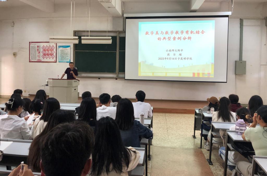 9月14日下午,应数学学院邀请,中学数学正高级教师、云南师大附中数学教研组长段尔超到校为数学学院师范生作题为《数学美与数学教学有机结合的典型案例研究》的讲座。