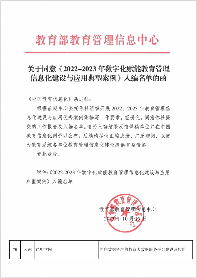 beat365官方网站依托学校数字校园建设成果,精心组织力量对学校教育大数据服务平台建设及应用工作进行总结凝练。经学校申报、教育厅推荐、教育部评审,最终作为云南省唯一高校项目入选案例名单。