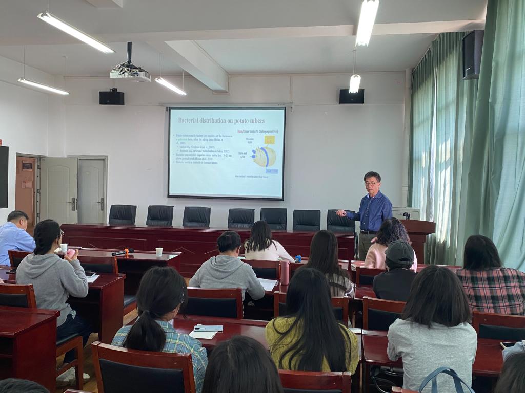 郝建军副教授在食品科学与农业工程领域有着深厚的学术背景和丰富的实践经验。讲座以“The Outbreak of Potato Blackleg and Soft Rot in the Northeastern US”为题,围绕美国东北部马铃薯黑腿和软腐病的研究发展趋势,向学院师生详细介绍了 Dickeya dianthicolo和Pectobacterium parmentieri与马铃薯块茎的感染机制以及发病原因、病原类型、传播类型及防病措施等,并与师生就植物病害防控技术等进行了深入交流讨论。本次讲座的开展为学院师生在植物病害防控领域的研究和发展提供了新的思路和启示,加强了国内外学术交流,拓宽了师生学术视野。