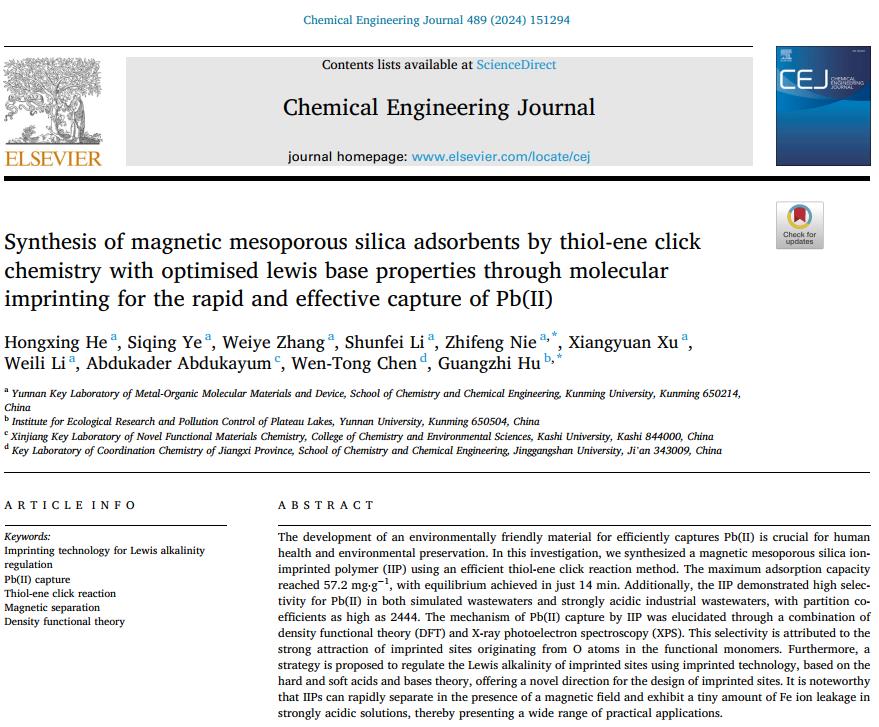 近日,化学工程领域国际期刊《Chemical Engineering Journal》(中科院1区TOP,影响因子:15.1)发表了beat365云南省金属有机分子材料与器件重点实验室课题组何红星副教授、聂陟枫研究员与云南大学胡广志研究员的合作研究成果“Synthesis of magnetic mesoporous silica adsorbents by thiol-ene click chemistry with optimised lewis base properties through molecular imprinting for the rapid and effective capture of Pb(II)”。beat365官方网站化学化工学院云南省金属有机分子材料与器件重点实验室为第一单位,何红星副教授为第一作者,研究生叶思卿为第二作者,聂陟枫和胡广志研究员为共同通讯作者。该成果得到了云南省基础研究计划重点、面上项目的资助。