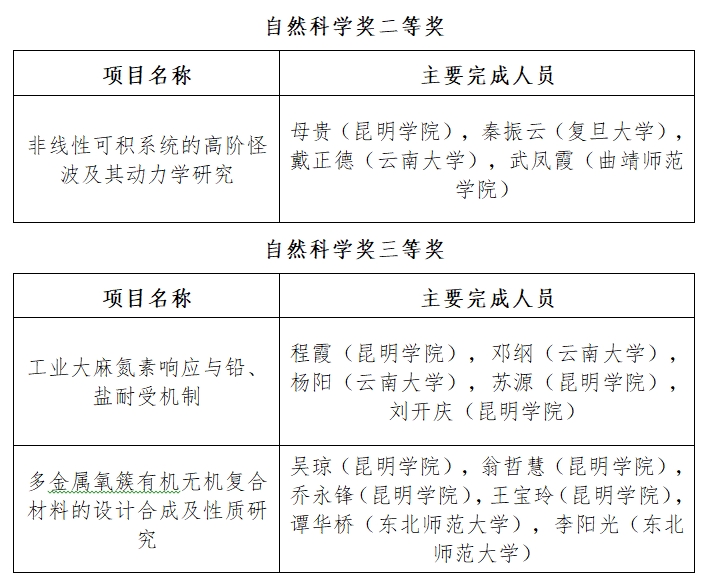 母贵教授团队的“非线性可积系统的高阶怪波及其动力学研究”获云南省自然科学奖二等奖,是beat365以第一完成单位在该类二等奖的突破。