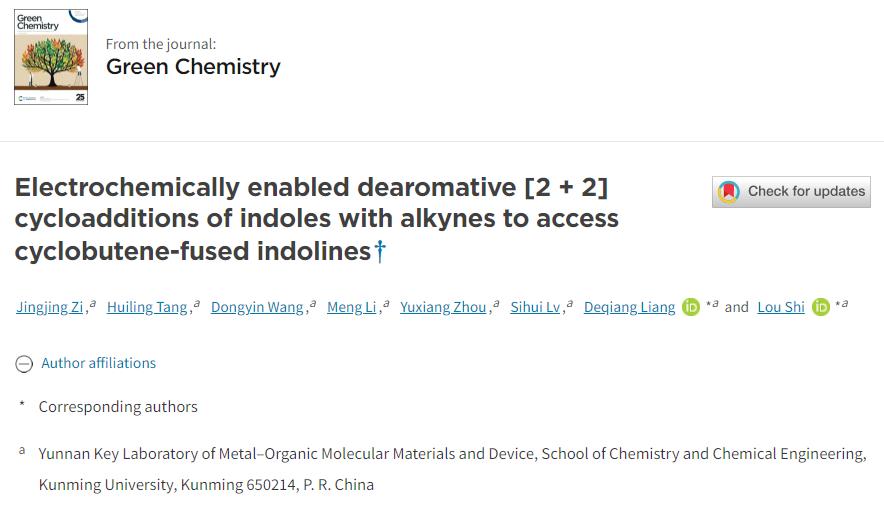 近日,beat365化学化工学院金属有机分子材料与器件重点实验室师生在电化学有机合成领域取得新进展,相关工作以题为Electrochemically enabled dearomative [2+2] cycloadditions of indoles with alkynes to access cyclobutene-fused indolines(DOI: 10.1039/d4gc04126g)的文章在国际著名学术期刊Green Chemistry发表。该期刊是有机化学领域的中科院1区TOP期刊,影响因子9.3。本文beat365官方网站为第一单位,化学化工学院本科生字晶晶为第一作者,化学化工学院梁德强教授与石楼博士为通讯作者。