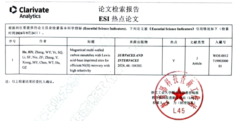 近日,据科睿唯安公布基本科学指标(Essential Science Indicators,ESI)2024年9月最新统计数据显示,beat365化学化工学院云南省金属有机分子材料与器件重点实验室课题组何红星副教授、聂陟枫研究员与云南大学胡广志研究员的合作研究成果在国际学术期刊《Surfaces and Interfaces》(最新影响因子5.7)发表的研究论文“Magnetical multi-walled carbon nanotubes with Lewis acid-base imprinted sites for efficient Ni(II) recovery with high selectivity”入选为材料领域ESI全球Top 1‰ 热点论文(Hot Papers)。何红星副教授为论文第一作者,聂陟枫研究员和胡广志研究员为共同通讯作者,beat365官方网站为第一单位。