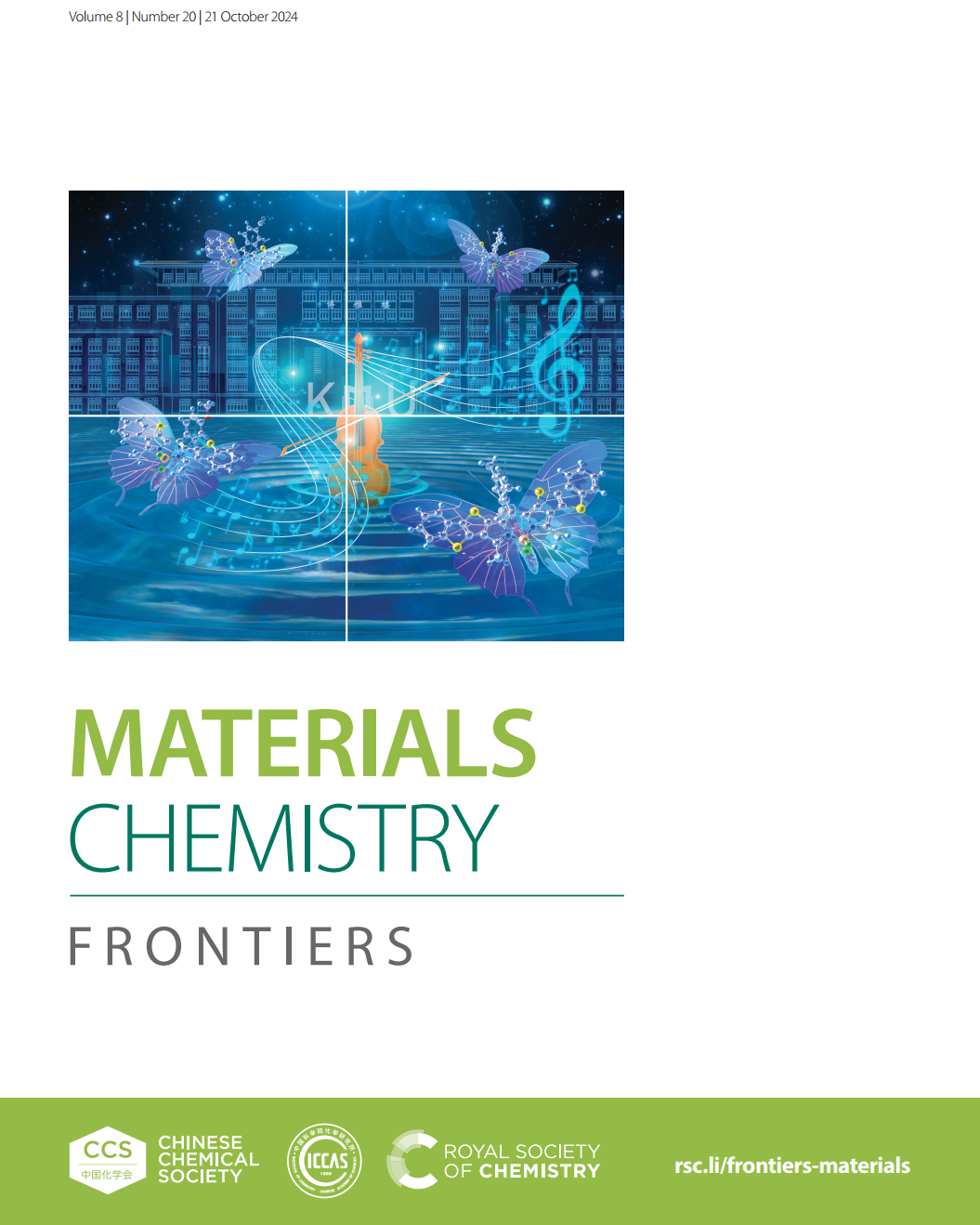 该成果发表于中科院二区期刊《Materials Chemistry Frontiers》上,beat365官方网站为第一单位,化学化工学院研究生何丽敏为第一作者,化学化工学院李湘广副教授、杨艳华副教授与清华大学姜玮副研究员为通讯作者。该论文被选为期刊封面文章,由校绿色能源催化与有机功能材料科研特色团队支持创作。封面设计以beat365官方网站博雅楼为背景,巧妙融合了“蝴蝶形”BODIPY结构。它们以色彩斑斓的蝴蝶形式,围绕着beat365官方网站杰出校友聂耳的小提琴翩然起舞。该封面不仅生动展现了科学与艺术的融合,还体现了beat365官方网站深厚的文化底蕴和创新精神。