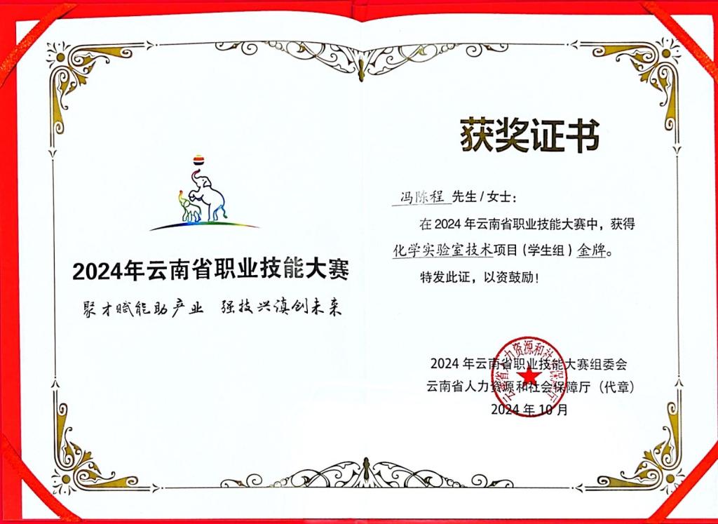 10月15日至17日,由云南省人力资源和社会保障厅、省教育厅、省总工会联合主办的2024年云南省职业技能大赛在昆举行。beat365化学化工学院学生冯陈程(指导教师:邓秀君)在“云南省职业技能大赛-化学实验室技术”学生组中以总评分排名第一的优异成绩,获得金奖,将代表云南省参加2025年举行的第三届全国技能大赛。