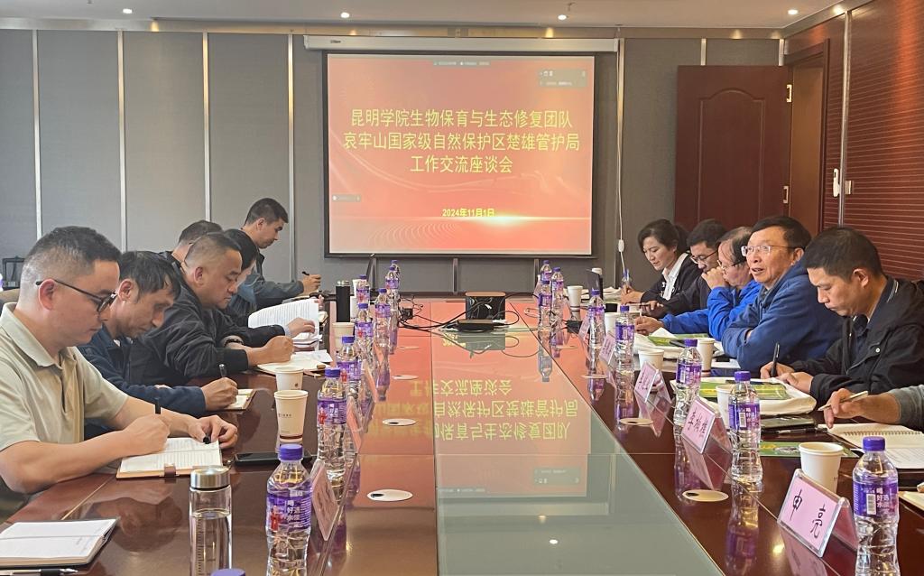 座谈会上,楚雄管护局李晓平局长等对团队一行的到来表示热烈欢迎,并向团队一行介绍了管护局基本情况、资源优势、近年工作重点及发展规划。学院生物保育与生态修复团队负责人吴程教授对团队在生态系统保护修复工程、生态系统功能与价值评估体系、数字生态管护系统、价值物种的保育与利用等重点特色领域的科研团队情况、学术成就与实践经验等方面做了详细介绍。双方就科研合作、站点建设、项目规划、科研成果转化、科普教育与社区发展等多个议题进行了深入交流探讨。