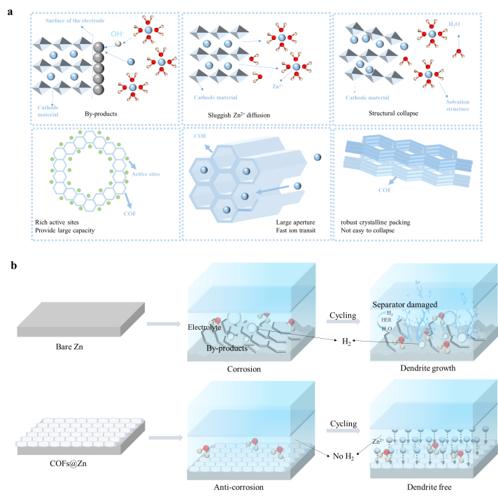 近年来,可充电锌离子电池(ZIBs)因其高安全性和低成本的理论容量而被认为是锂离子电池的有前景的替代品。然而,可充电锌离子电池的深入发展受到一系列问题的限制,如阴极材料的溶解和结构坍塌、副产物的形成、严重的阳极腐蚀、钝化和锌枝晶的生长。共价有机骨架(COF)由于其理想的特性,如刚性结构、不溶性、高孔隙率和丰富的活性位点,可以在一定程度上解决上述问题。这篇文章系统地总结了COFs的合成方法,讨论了几种先进表征技术在COF中的应用,为COF的深入研究提供了参考。此外,文章阐明了COF在可充电ZIB中作为阴极材料和阳极保护层的用途。最后,文章讨论了COF材料开发中的挑战和解决方案,这将为COF的未来发展方向提供建设性的见解。