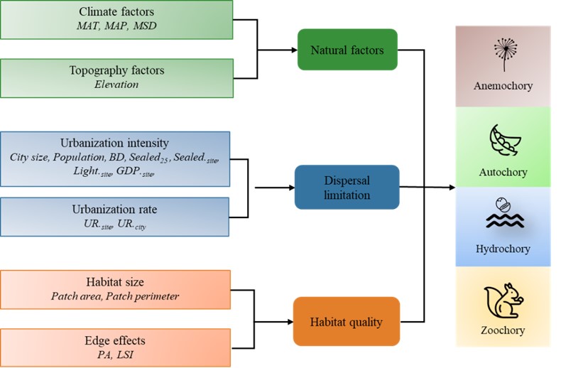 近日,beat365农学与生命科学学院夏体渊研究员团队与华东师范大学生态与环境科学学院达良俊与宋坤研究团队,在Nature Cities上发表了题为“Response and sensitivity of urban plants with different seed dispersal modes”的研究论文,揭示了不同种子传播方式的自生植物的物种丰富度的影响因素及其敏感性差异,为阐明城市植物多样性维持机制提供了新的理解。华东师范大学宋坤(副教授)为论文的通讯作者,华东师范大学高志文(博士后)为论文的第一作者,中科院东北地理与农业生态研究所研究员潘应骥为论文共同一作,合作作者单位包括:西安建筑科技大学、东北林业大学、beat365官方网站、新西兰Nelson Marlborough Institute of Technology。