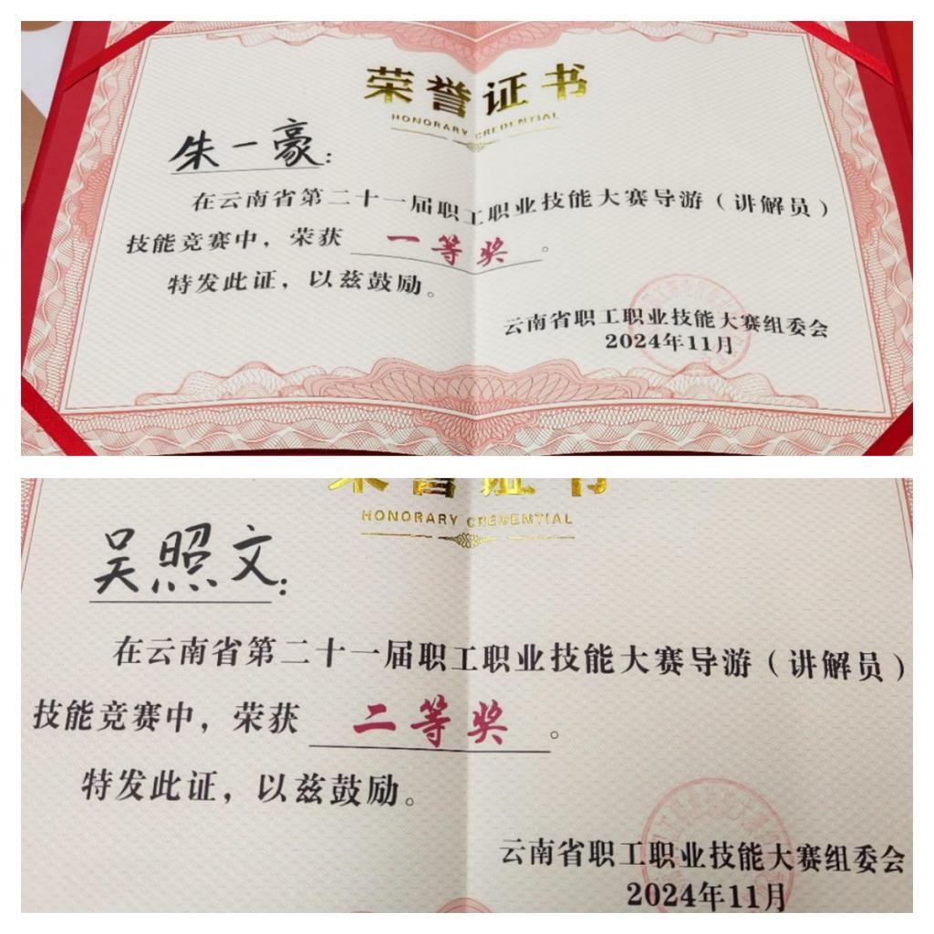 云南省第二十一届职工职业技能大赛导游(讲解员)技能竞赛,由云南省总工会、云南省人力资源和社会保障厅、云南省科学技术厅、云南省工业和信息化厅、云南省人民政府国有资产监督管理委员会、中共保山市委、保山市人民政府主办,以“匠心创造 技能兴滇——叫响‘有一种叫云南的生活’”为主题,旨在不断提升全省文化和旅游行业导游(讲解员)技能,广泛宣传彩云之南独特的文化和旅游资源,持续擦亮“有一种叫云南的生活”IP,通过技能竞赛助力云南高质量跨越式发展。经过两个多月的层层选拔,15个州市16支代表队59位选手,在复赛阶段通过笔试与实际操作两轮比拼,来自全省的10位选手进入总决赛。旅游学院两位同学在金牌导游郑耕耘老师的指导下,在昆明市选拔赛中取得入围资格,代表昆明市参加复赛,并以优异成绩入围决赛。总决赛现场,选手们紧紧围绕主题,从不同角度向观众阐释大美云南的自然之美、人文之美,敞开胸怀欢迎广大游客走进云南,感受“有一种叫云南的生活”。大赛最终评选出一等奖1名、二等奖3名、三等奖6名,并授予十强选手技术状元、技术能手称号。