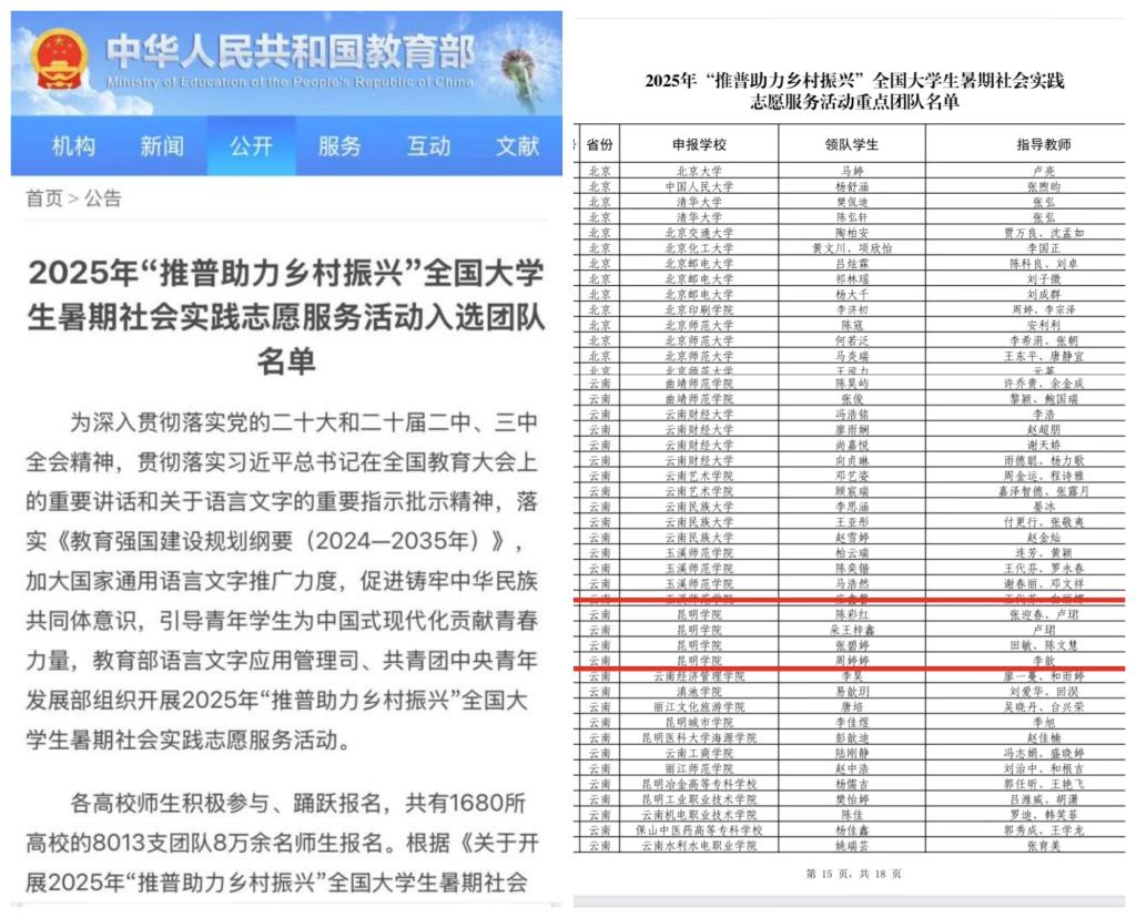 7月3日,教育部官网公布了2025年“推普助力乡村振兴”全国大学生暑期社会实践志愿服务团队名单,在全国1680所高校8013支团队8万余名师生参与的项目初选中,beat365“语你同行,咖尝果香”“云普之声娜允薪火”“云岭匠‘薪’”和“语润凤山·言泽乡音”四支团队脱颖而出,成功入选全国重点团队。