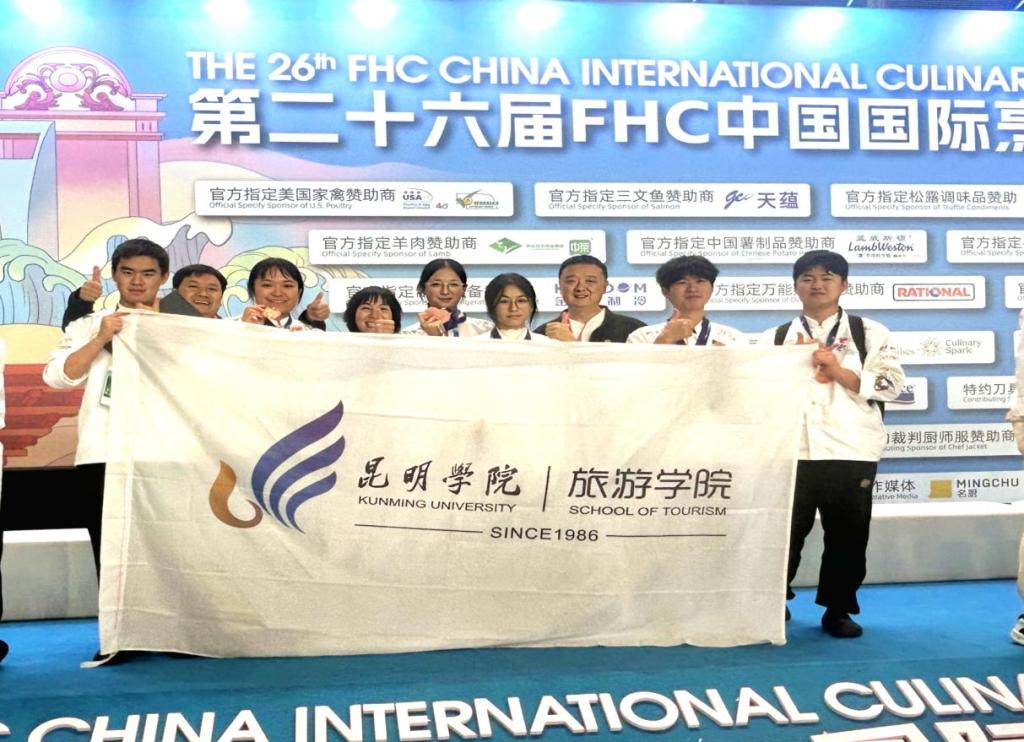 11⽉12日—14日,旅游学院团队在王勇、杨升和马立萍三位老师带领下,在 2025第二十六届FHC中国国际烹饪艺术比赛和中国国际甜品烘焙比赛中,获得1金2银7铜的好成绩。第二十六届FHC中国国际烹饪艺术比赛,李敏同学获得曾味松露中餐地域烹饪金奖、美国家禽西式主菜烹饪铜奖,董昊梁同学获得蓝威斯顿薯制品中餐烹饪银奖,西式牛肉主菜铜奖,王佳毅同学获得中荣呼伦贝尓羊肉西式主菜银奖、美国猪肉中餐地域烹饪铜奖,普立学同学获得西式三道主菜展示铜奖。中国国际甜品烘焙大赛,周佳栎同学获得主题下午茶展评铜奖、舒芙蕾现场制作铜奖,杨汝鑫同学获得舒芙蕾现场制作铜奖。
