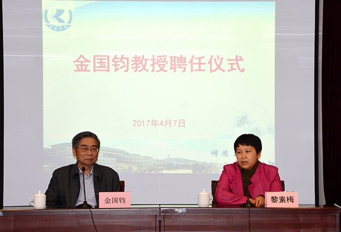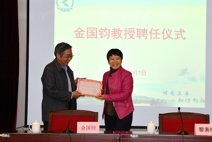 4月7日,学校举行仪式聘请金国钧教授为beat365特聘教授,仪式由物理科学与技术系副主任杨海教授主持,校长黎素梅向金国钧教授颁发了聘任证书。