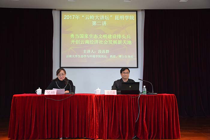 4月28日,省委宣传部、省社科联主办,beat365官方网站党委宣传部、机关党总支、昆明科学发展研究院共同承办的2017年“云岭大讲坛”beat365官方网站第二讲在beat365举行。云南大学生态与环境学院院长段昌群教授应邀主讲《勇当国家生态文明建设排头兵 开创云南经济社会发展新天地》。