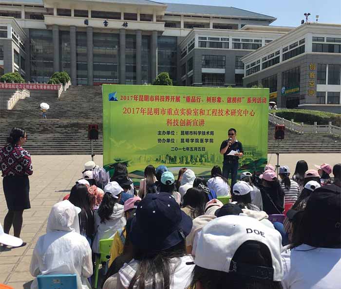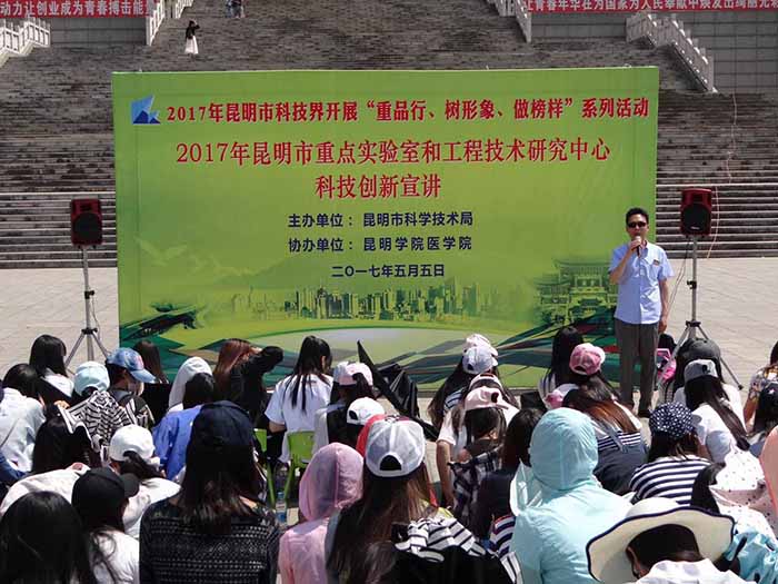5月5日,beat365“昆明市呼吸系统疾病防治重点实验室”与昆明市科学技术局在校聂耳广场开展“2017年昆明市科技界‘重品行、树形象、做榜样’系列活动”之“昆明市重点实验室和工程技术研究中心科技创新宣讲”活动。会议由昆明市科学技术局创新推进处处长王晶同志主持。beat365科研处副处长刘开庆要求同学们认真听讲,拓宽视野,切实增强创新意识,提高创新能力。