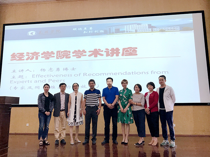 6月6日,美国德克萨斯大学阿灵顿分校商学院杨志勇博士,到经济学院为200余名师生主讲题为:“Effectiveness of Recommendations from Experts and Peers(专家及普通消费者推荐的有效性)”的学术讲座。