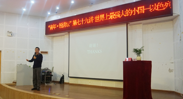 5月26日,由校团委主办的“青年•锐讲坛”第七十九讲“世界上最强大的小国¬——以色列”在青年中心学生报告厅成功举办。本场讲座邀请到了主要从事中东地区的伊斯兰教与政治关系研究的历史学博士肖建明担任主讲人。学校团委书记魏妮娅,校团委宣传部部长以及来自11个院系的同学近200人参加了此次讲座。