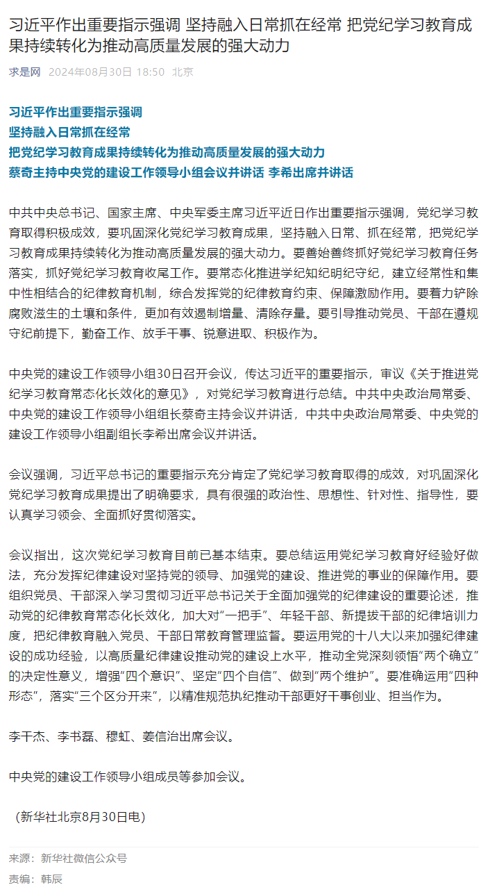习近平作出重要指示强调 坚持融入日常抓在经常 把党纪学习教育成果持续转化为推动高质量发展的强大动力