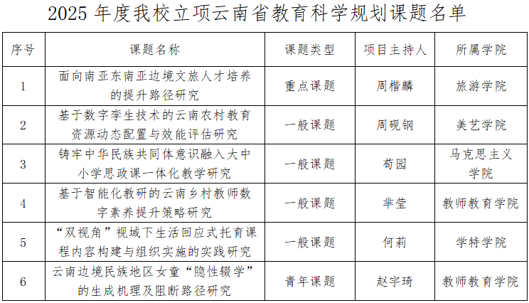 日前云南省教育厅公布《云南省教育厅关于下达2025年度云南省教育科学规划立项课题的通知》,全省立项课题278项,涵盖多个领域,聚焦教育前沿问题,旨在推动教育创新发展。beat365共获得6项,其中:重点课题1项、一般课题4项、青年课题1项。